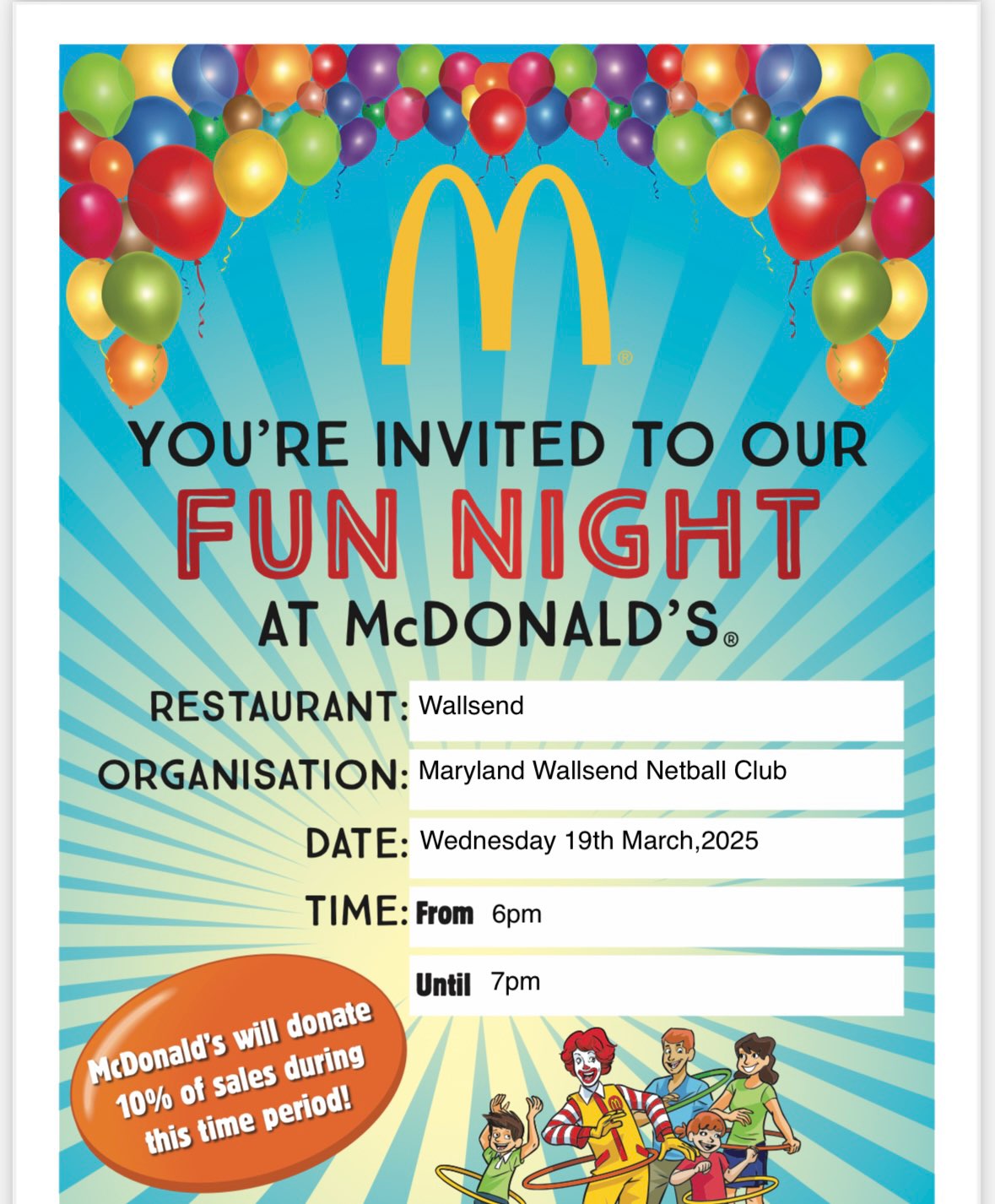 This Wednesday (23rd July) is Maryland Wallsend Netball Club McDonalds fund-raiser night. Take a night off from cooking dinner and treat the family. Eat in store, drive thru or order on-line and pick up, it all still adds up to help our club.